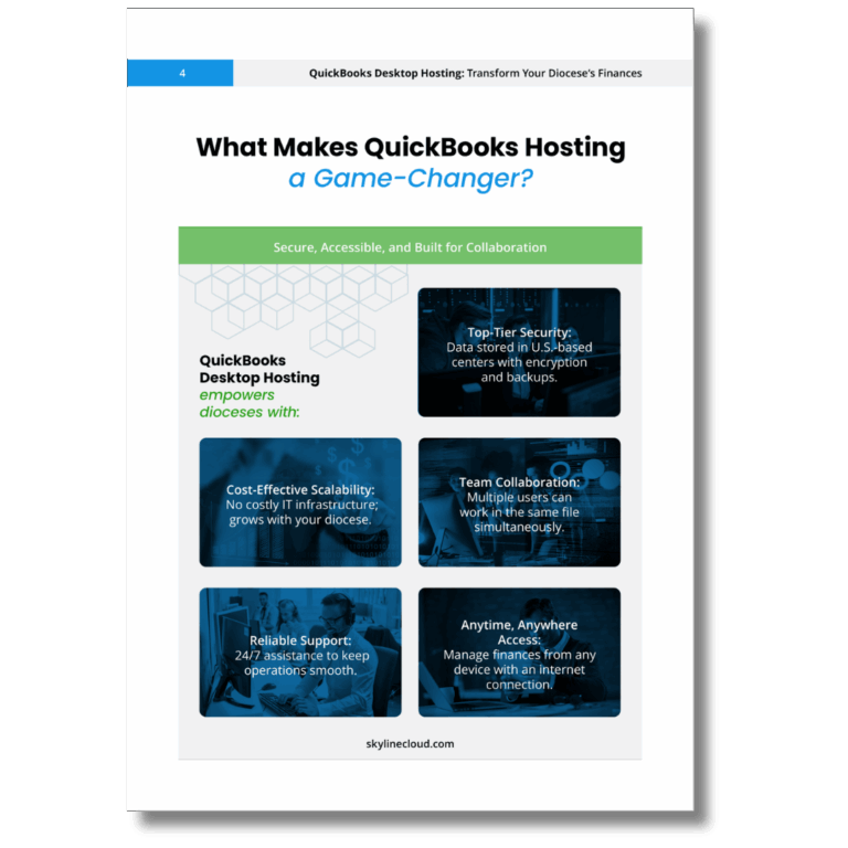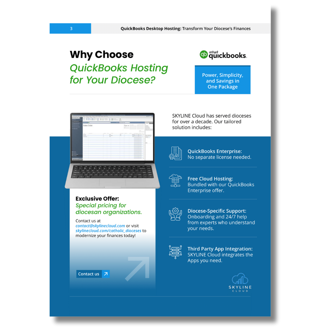 Managing finances across parishes, schools, and ministries doesn’t have to be complex. QuickBooks Desktop Enterprise, hosted by SKYLINE Cloud, offers a secure, scalable, and collaborative solution to streamline your diocese’s accounting. Download our free whitepaper to learn how.